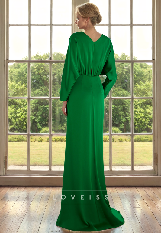 V-Neck Long Sleeves Ruched Side Slit Sheath Mother of Bride Dress