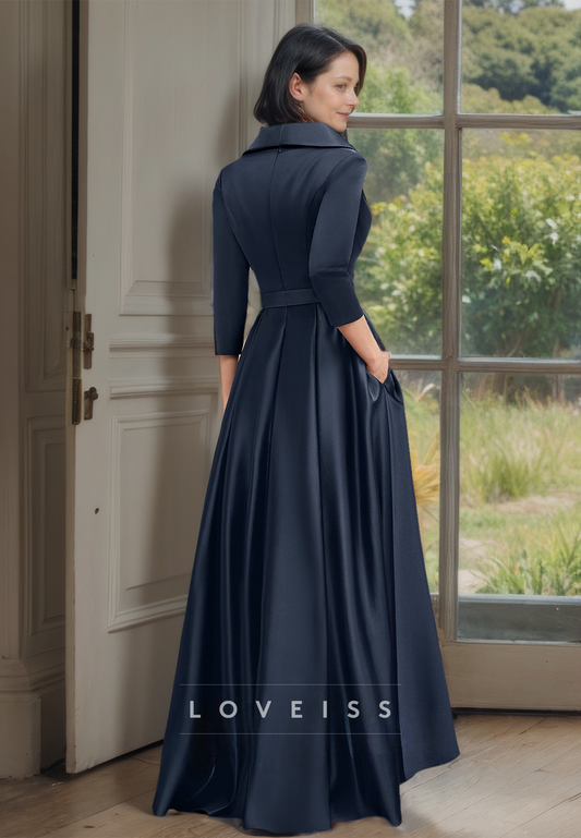 V-Neck Long Sleeves Pleated Satin A-Line Mother of Bride Dress