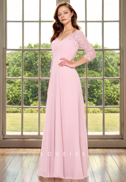 V-Neck Long Sleeves Pleated Sleek A-Line Mother of Bride Dress