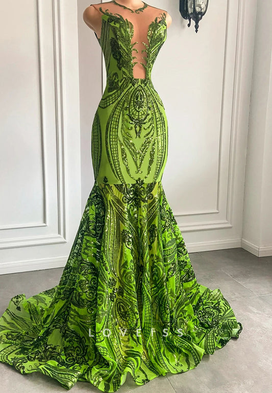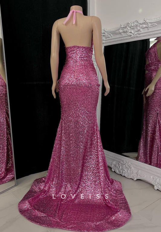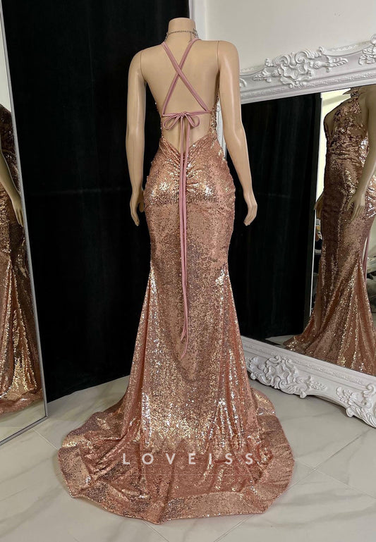 Halter Sleeveless Sequins Illusion Sparkly Sheath Prom Dress for Black Girls