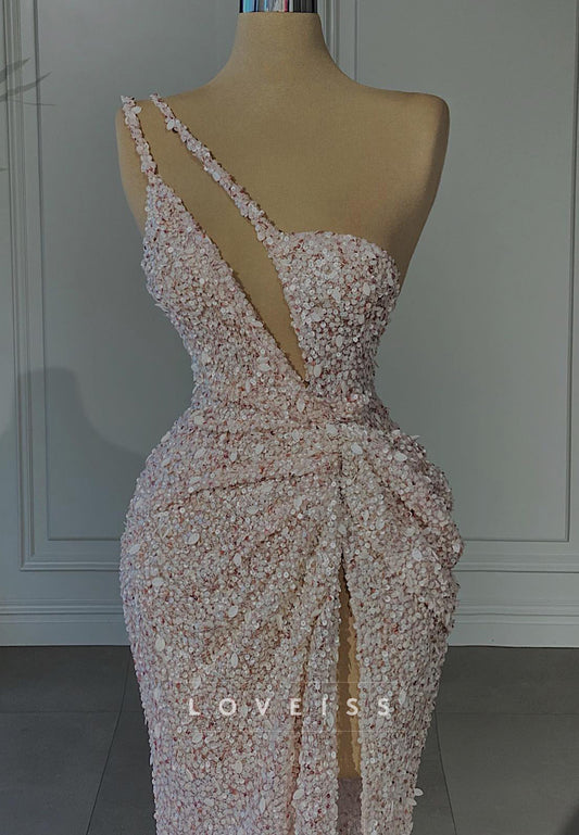 One Shoulder Illusion Sequins Evening Dress Sparkly Sheath Party Dress