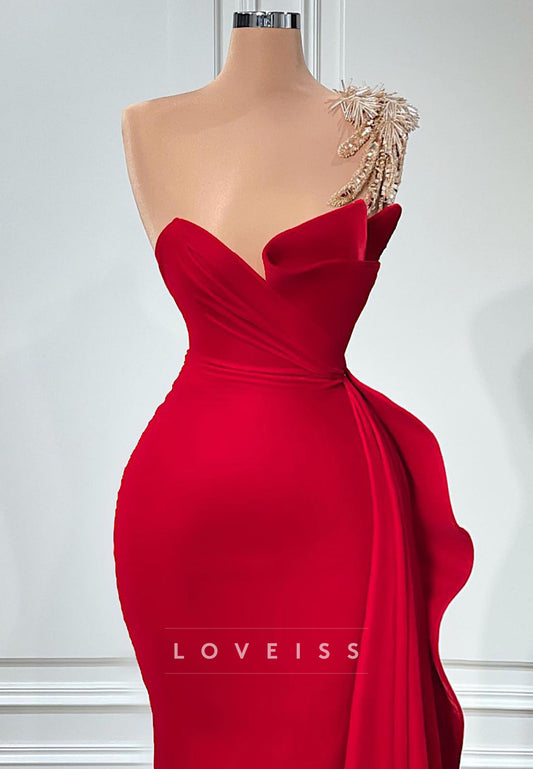 One Shoulder Sleeveless Beaded Formla Dress Pleated Mermaid Evening Dress