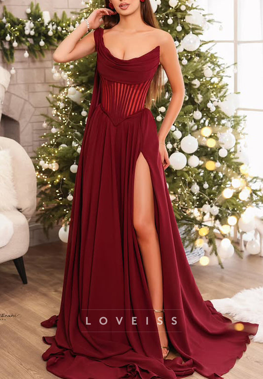 Off-Shoulder Pleated Ruched Side Slit Sparkly Sheath Evening Dress