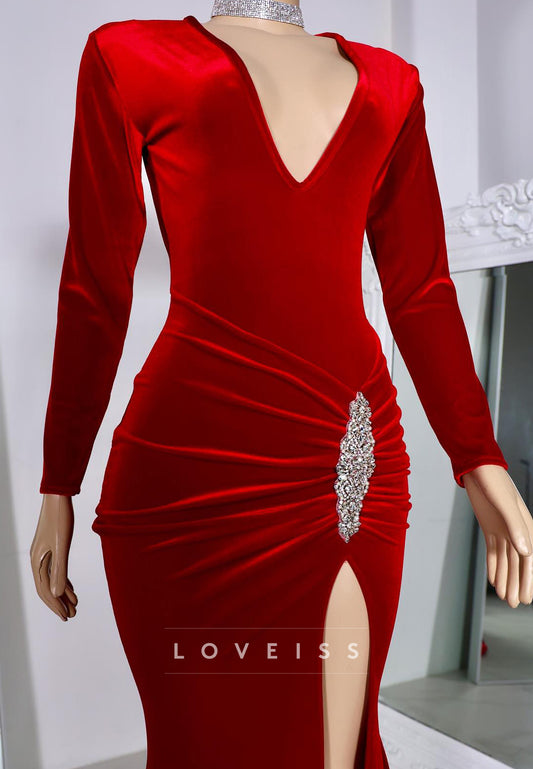 V-Neck Long Sleeves Baeded Pleated Formla Dress Sheath Evening Dress