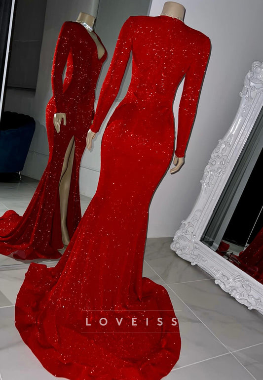 V-Neck Long Sleeves Sparkly Sheath Prom Dress for Black Girls