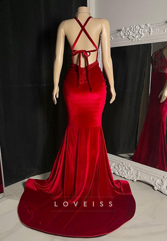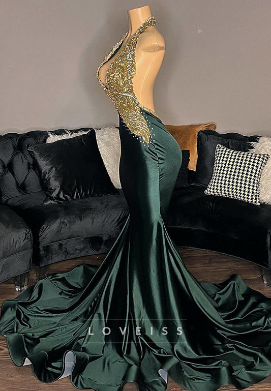 V-Neck Backless Appliques Beaded Mermaid Prom Dress for Black Girls