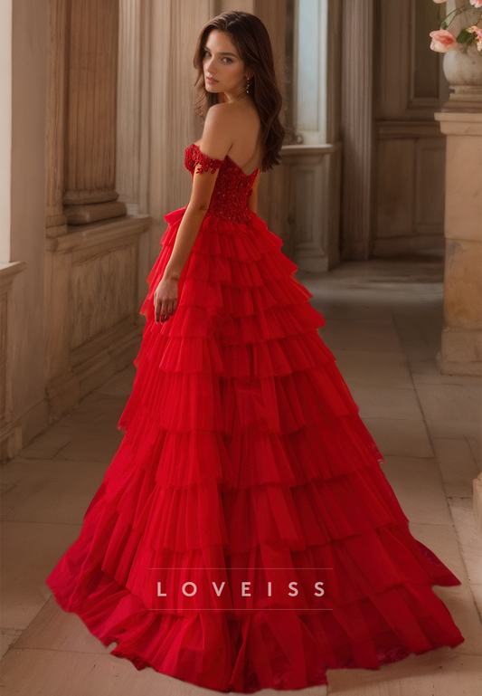 Off-Shoulder Sleeveless Appliques Tiered Ball Gown Prom Dress