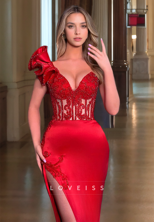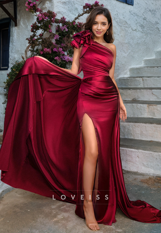 One Shoulder Sleeveless Ruffled Appliques Side Slit Sheath Prom Dress