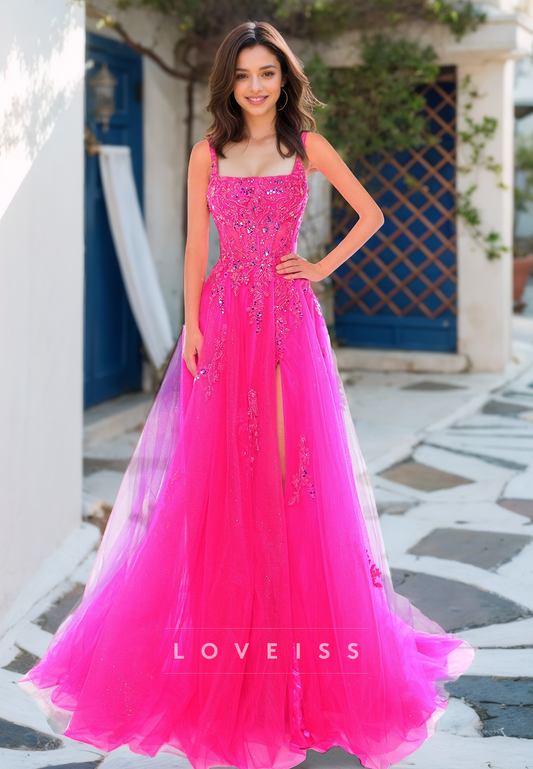Square Straps Appliques Side Slit Ball Gown A-Line Prom Dress