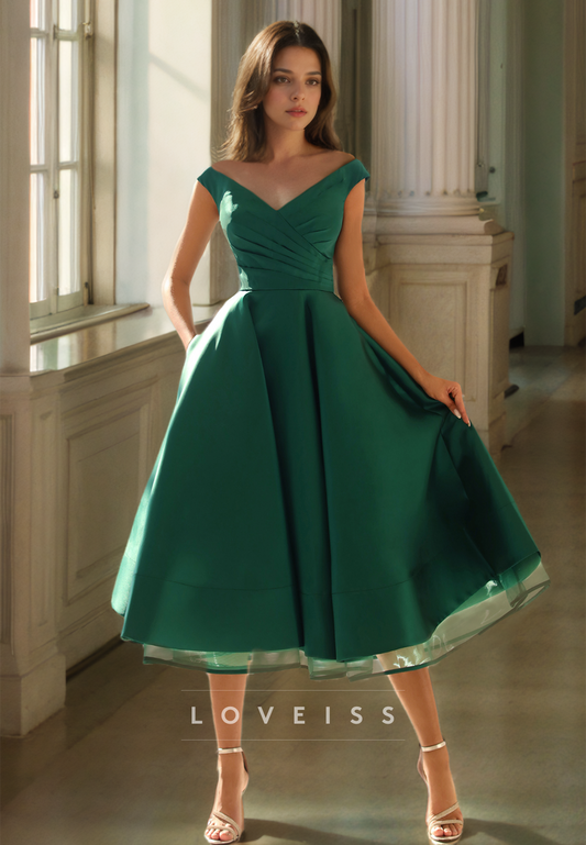 V-Neck Cap Sleeves Pleated Satin A-Line Prom Dress
