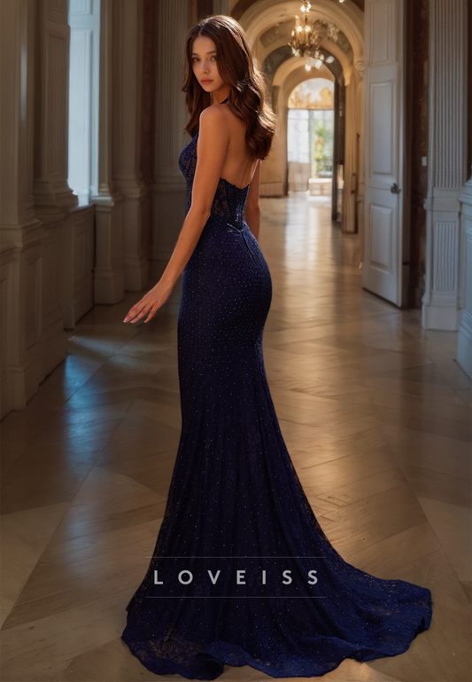 Sweetheart Sleeveless Side Slit Beaded Sheath Sparkly Prom Dress