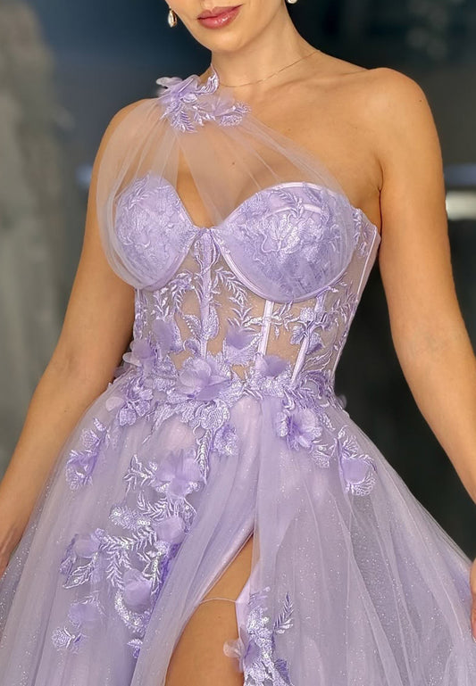 One Shoulder Sleeveless Floral Applqiues A-Line Prom Dress