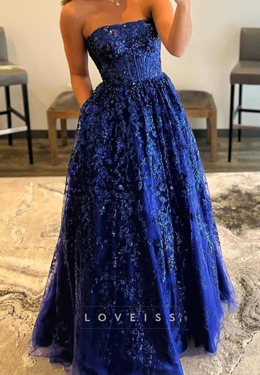 Straight Across Sleeveless Sequins Appliques A-Line Prom Dress