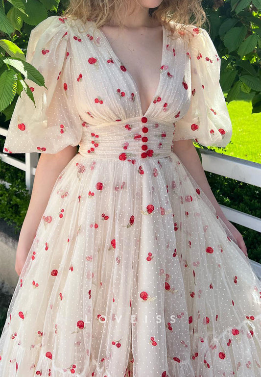 V-Neck Short Sleeves Pleated A-Line Prom Dress