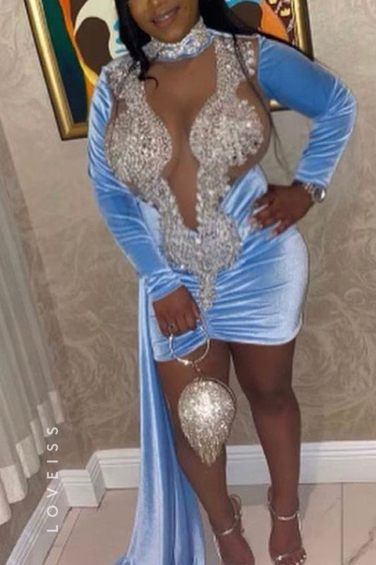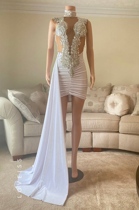 S6027 - Glamorous & Dramatic Illusion Cutout High neck Long Sleeves Ruched Homecoming Dress With Rhinestone