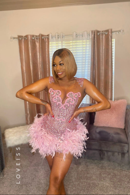 S6028 - Chic & Modern Sheer V neck Sleeveless Rhinestone Homecoming Party Dress With Feathers