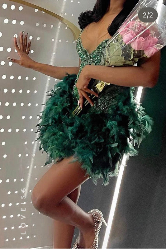 S6025 - Glamorous & Dramatic Sheer Deep V neck Sleeveless Fully Sequined Homecoming Party Dress With Feathers