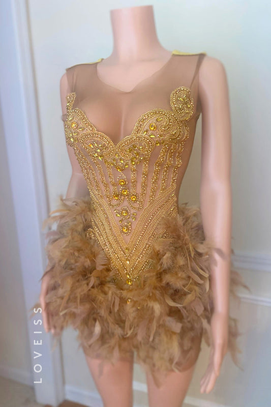 S6024 - Chic & Modern Sheer V neck Sleeveless Beaded Feathers Homecoming Party Dress
