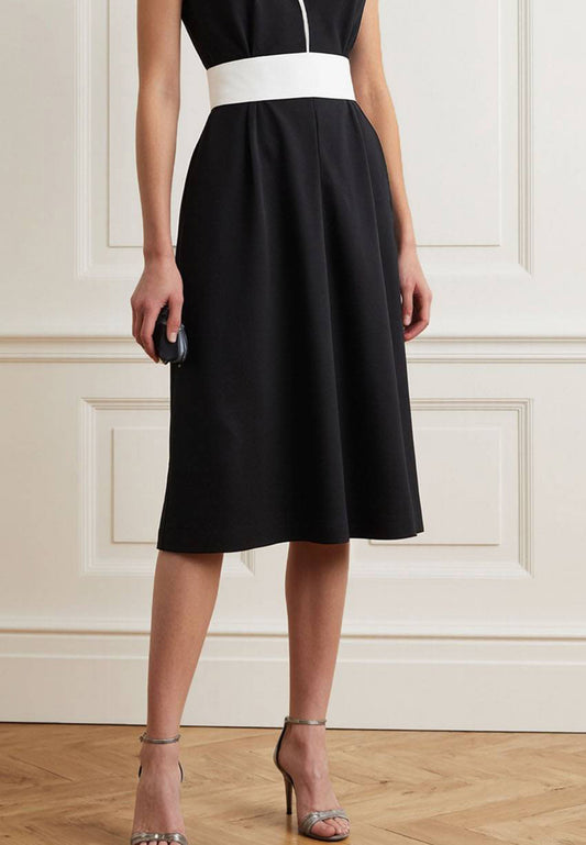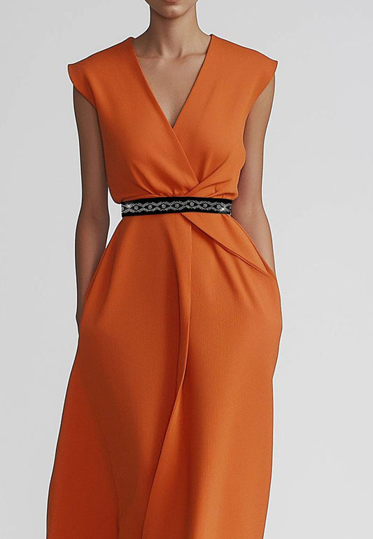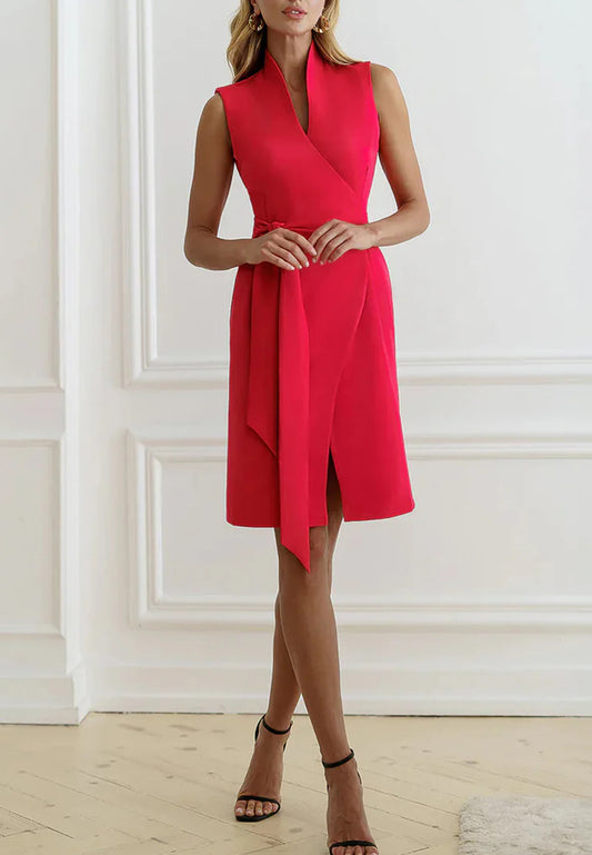 Work Dress V-Neck Sleeveless Belt Sleek A-Line Midi Dress