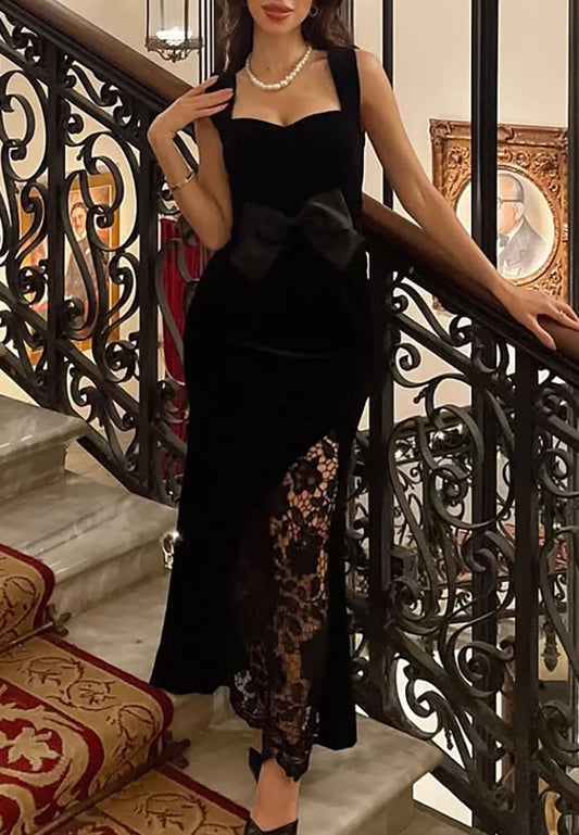 Black Lace Bow Sleeveless Mermaid Maxi Velvet Dress