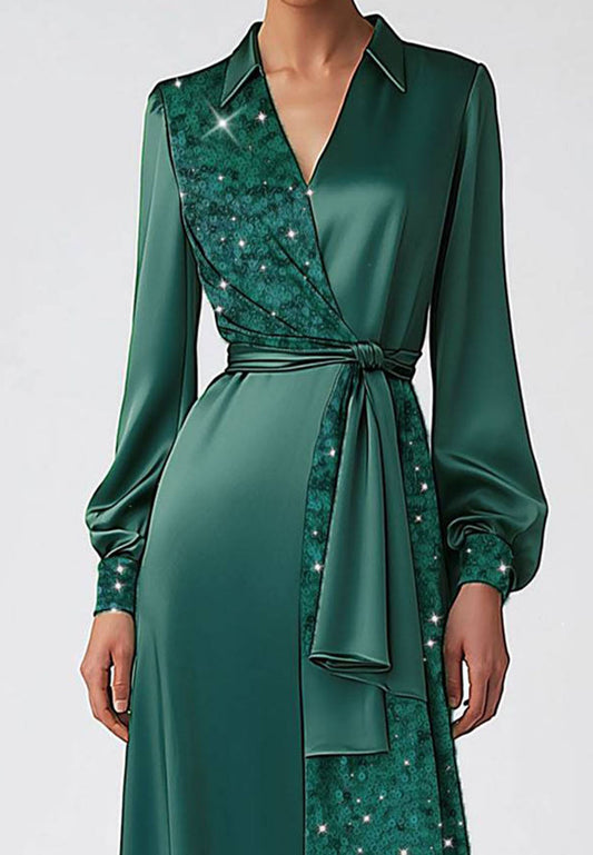 Daily Dark Green Dress V-neck Satin Sequins Sleek Cocktail Casual Dress