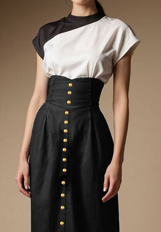 High Neckline Short Sleeves White Black Buttoned Work Midi Dress