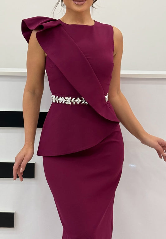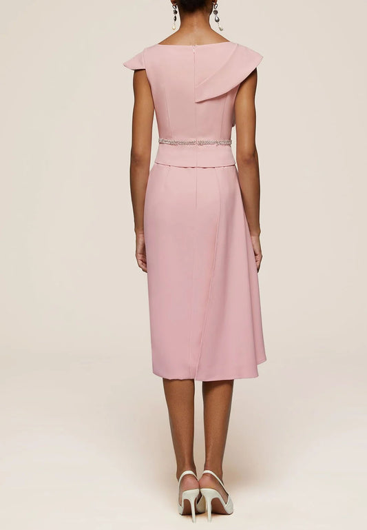 Pink Asymmetrical Neck Cap Sleeve Rhinestone A-Line Midi Dress