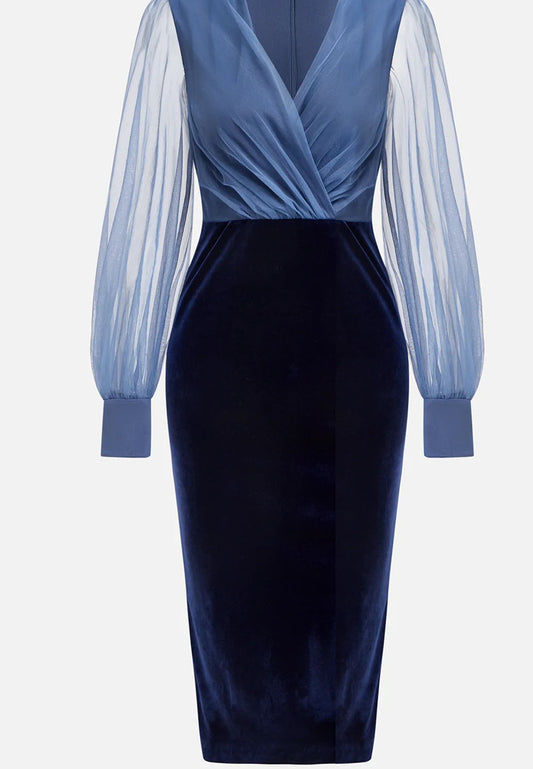 Purplish Blue Mesh Split Joint Balloon Sleeve Sheath Midi Velvet Dress