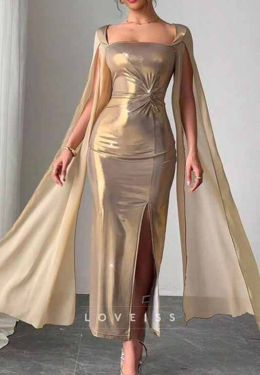 Square Long Sleevess Ruched Sleek Sheath Cocktail Dress