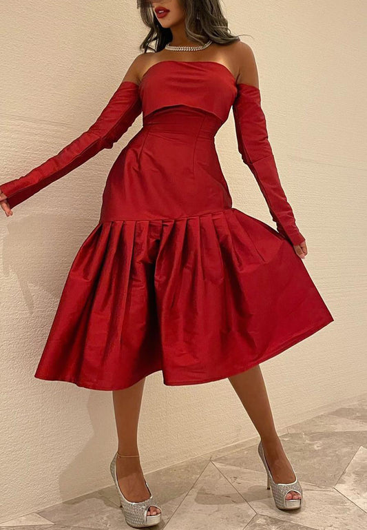 Evening Party Red Dress Color-block Deep V Pleated Floor-Length Dress