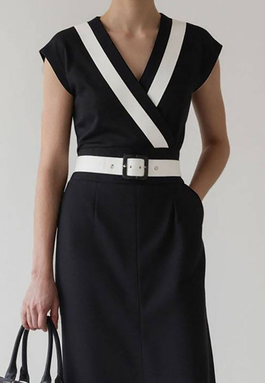 V-Neck Cap Sleeves Belted Work Bussiness Midi Dres