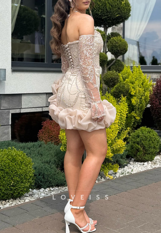 Off-Shoulder Long Sleeves Beaded Embroidery Ruched Sheath Party Homecoming Dress