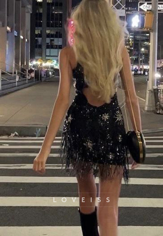 Straight Across Sequins Feathered Sheath Party Homecoming Dress
