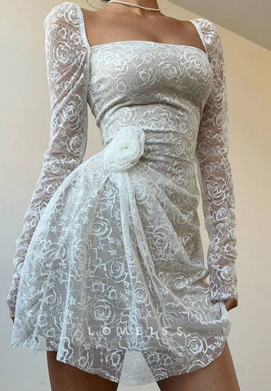 Square Long Sleeves Lace Appliques Ruched A-Line Party Homecoming Dress