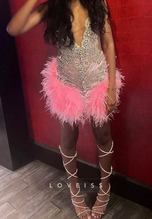 V-Neck Feathered Beaded Sleeveless Sheath Party Homecoming Dress