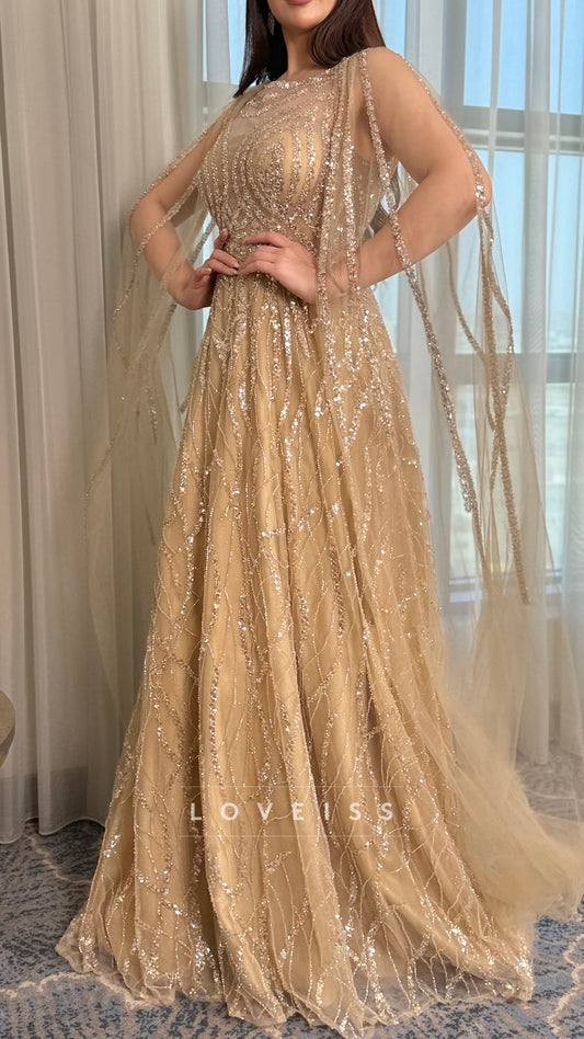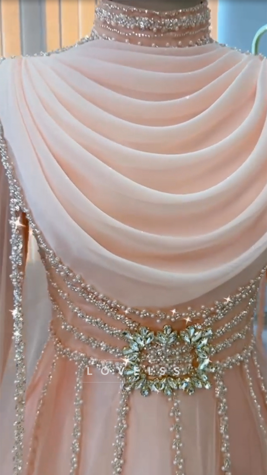 High Neck Long Sleeves Beaded A-Line Evening Dress