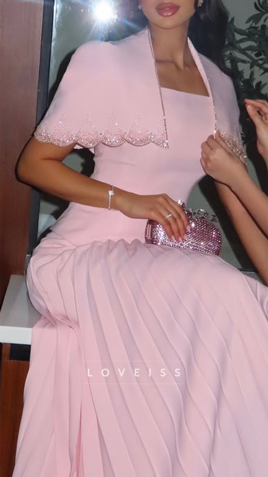 Square Cap Sleeves Pleated A-Line Pink Evening Dress