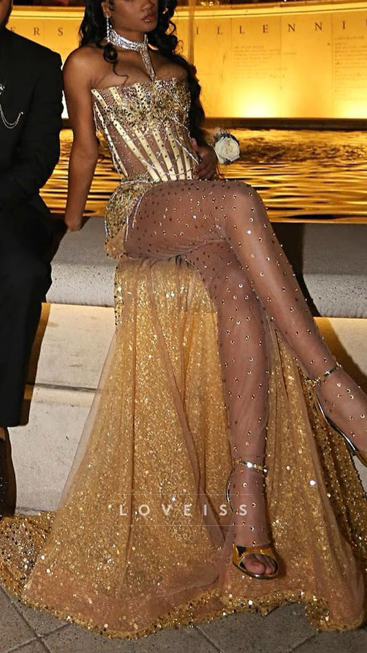 Strapless Rhinestones Side Slit Sheath Prom Dress