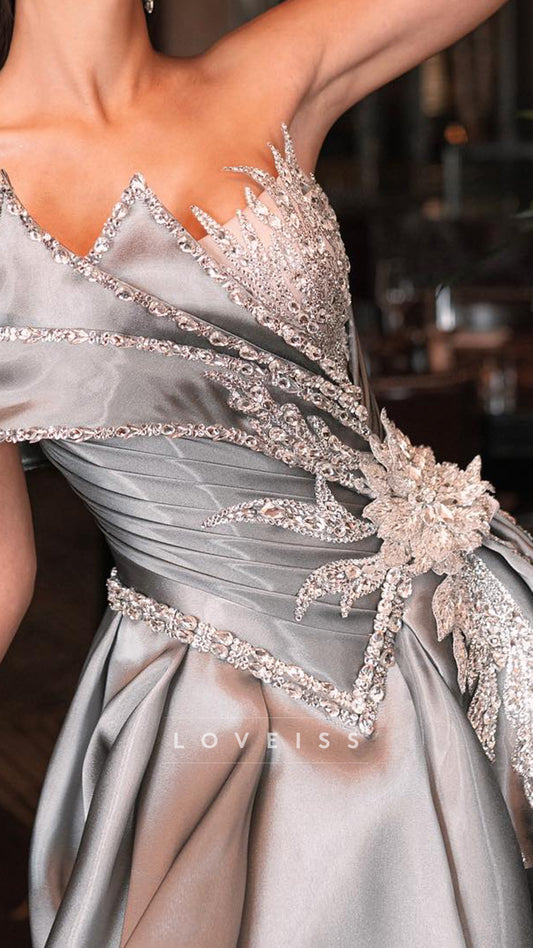 Asymmetrical Sleeveless Appliques Beaded A-Line Satin Evening Dress