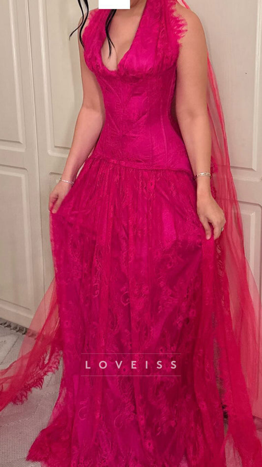 Halter V-Neck Lace Appliques A-Line Prom Dress
