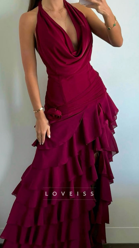 Halter V-Neck Sleeveless Tiered A-Line Prom Dress