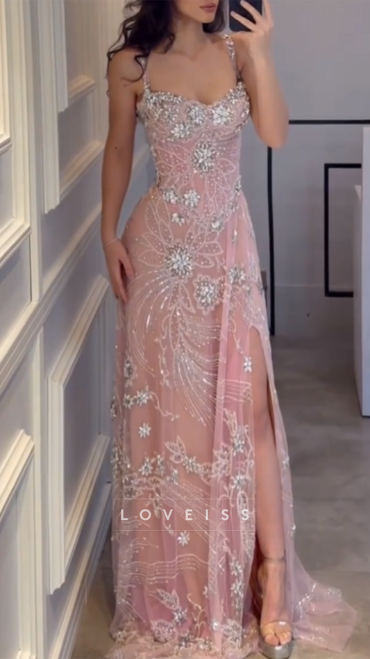 Sweetheart Straps Beaded A-Line Appliques Tulle Prom Dress