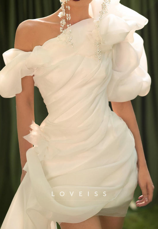 One Shoulder Puff Sleeves Pleated Short Wedding Dress