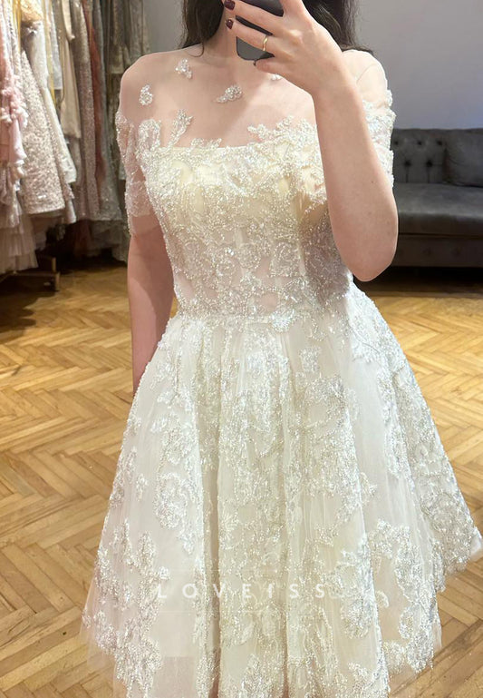 Scoop Short Sleeves Appliques Sparkly A-Line Short Wedding Dress