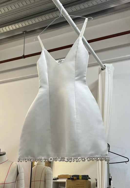 V-Neck Spaghetti Straps Beaded Embroidery A-Line Short Wedding Dress