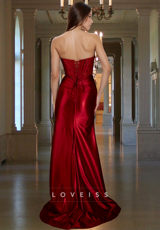 Sweetheart Strapless Sequins Pleated High Slit Sheath Prom Dress