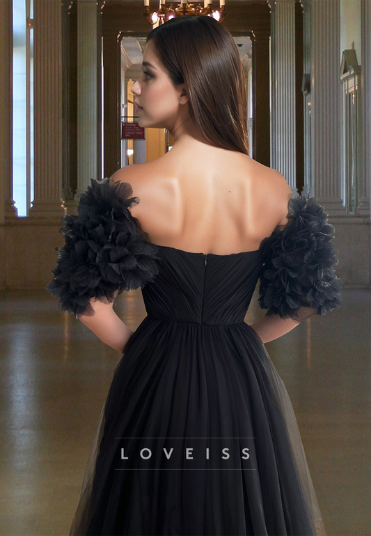 V-Neck Short Sleeves Pleated Tulle Side Slit A-Line Prom Dress