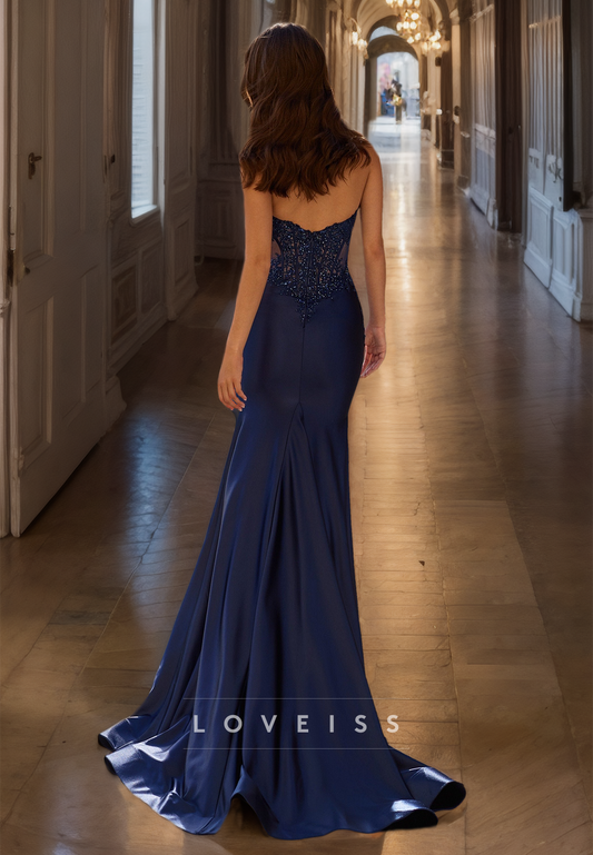 V-Neck Strapless Sheer Illusion Side Slit Sheath Sparkly Evening Dress