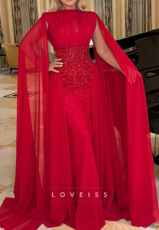Bateau Long Sleeves Chiffon Beaded Mermaid Evening Dress
