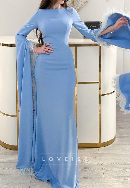 Bateau Long Sleeves Feathered Sleek Sheath Mother of Bride Dress